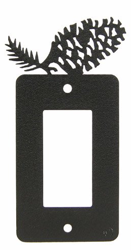 Description: A pinecone sits on top of this reversible GFI rocker light switch plate cover. Can be installed facing either direction. Laser cut with outstanding quality and detail. Fits all standard GFI and rocker switches. Mounting hardware included.Size: 3-1/2" wide x 6-1/2" tall.Material:18 gauge steel.Finish: Black wrinkle powder coat. Read more...