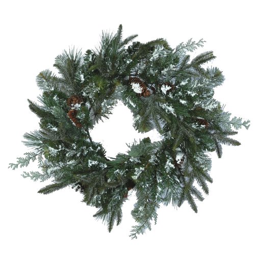 Flocked Winter Mixed Pine Artificial Christmas Wreath-Unlit. Case Pack: 6.00. Warranty: 1 Year seasonal. Tips: 227. Mixture of flocked pine needles. Accented with Pine Cones. Sturdy metal base for hanging. Material(s): PVC. For indoor use only. Height: 30". Width: 30". Read more...
